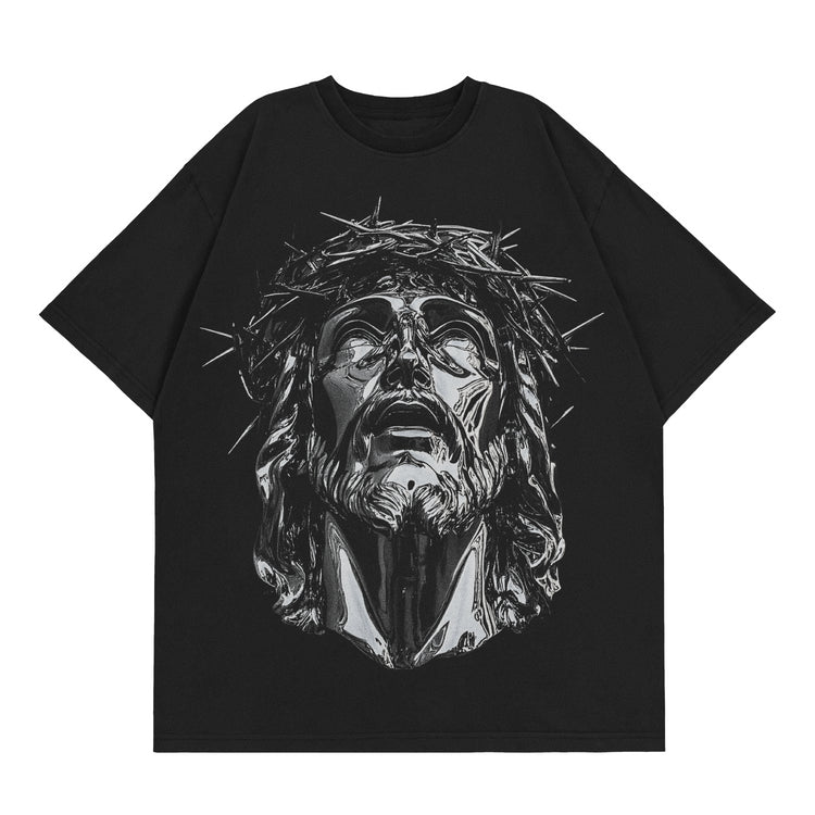 The image of "Chrome Christ" crowned in thorns is more than art—it’s a reminder of the price He paid and the glory He carries. On the cross, Jesus bore our sin, and through His resurrection, He reigns eternally. The bold declaration on the back—HOLY FOREVER—echoes the cry of heaven (Revelation 4:8), where angels never stop declaring His holiness.